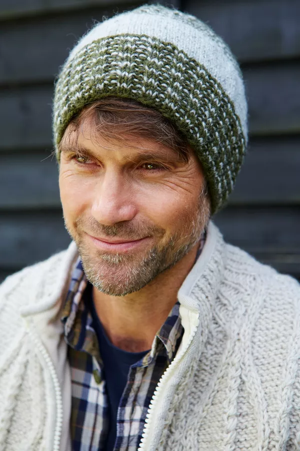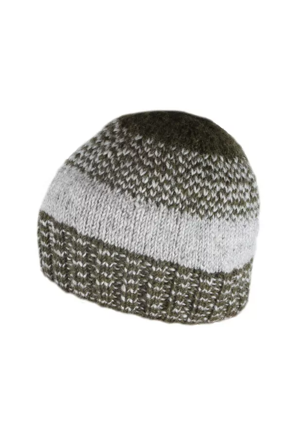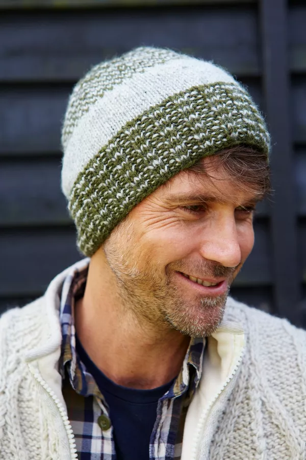 Men's hand knitted wool hat with two-tone design, fair trade and handmade in Nepal.
