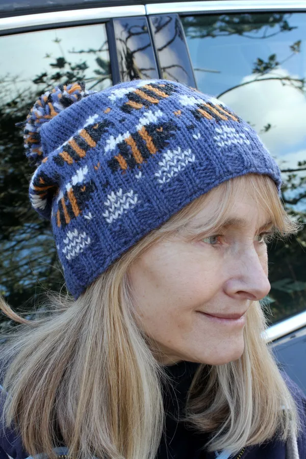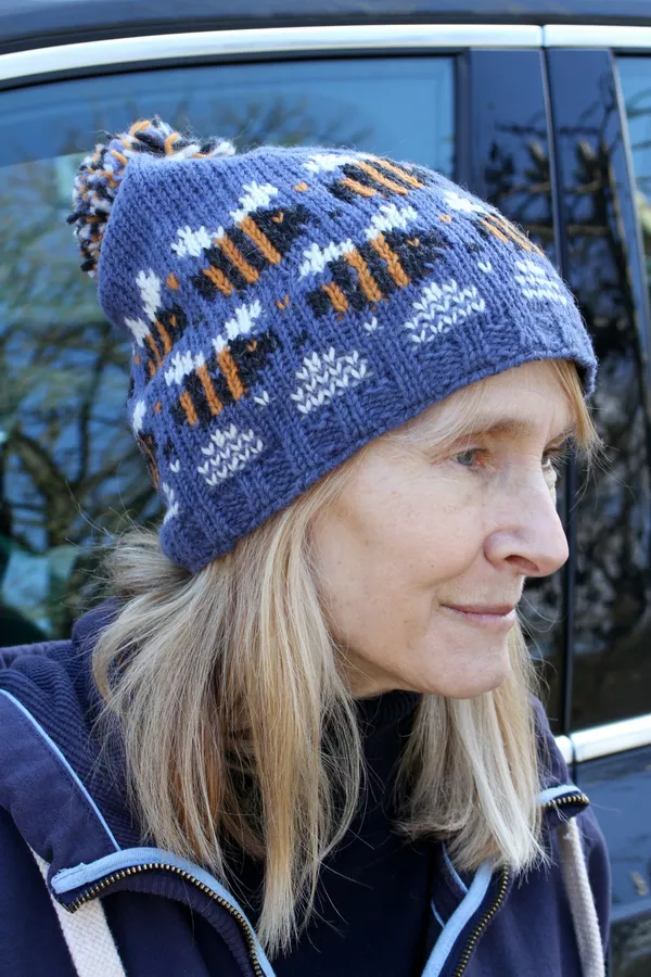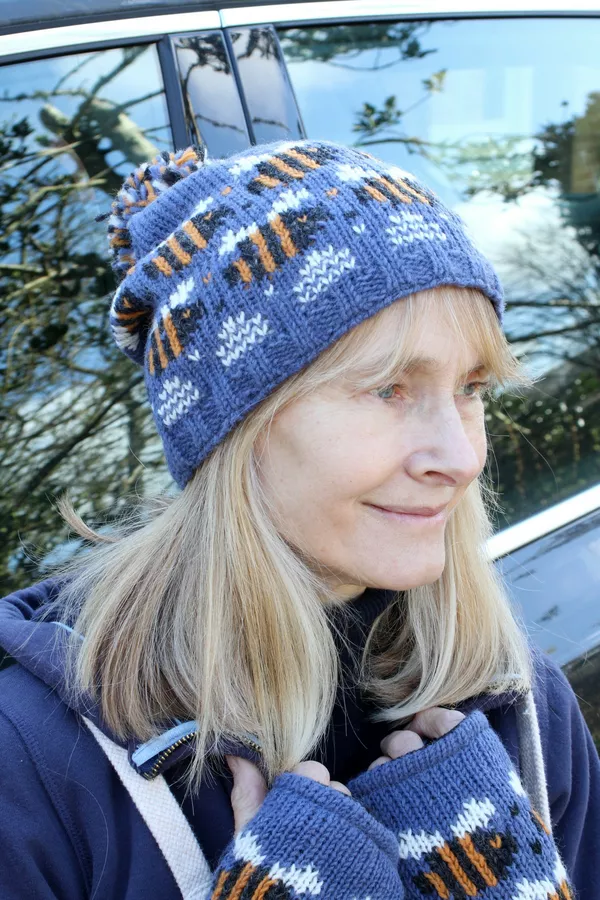 Women's knitted woolly bobble beanie bee hat. Beehive patterns with a denim blue shade for the nature lover. Fair trade and handmade in Nepal.
