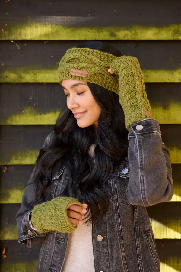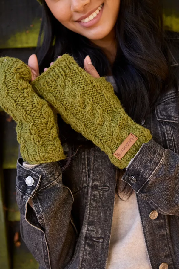 Pachamama hand knitted wool fingerless gloves, classic cable knit, fair trade and handmade in Nepal.