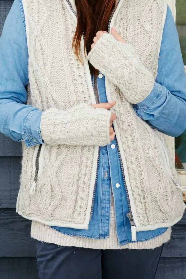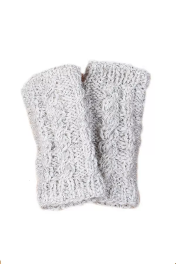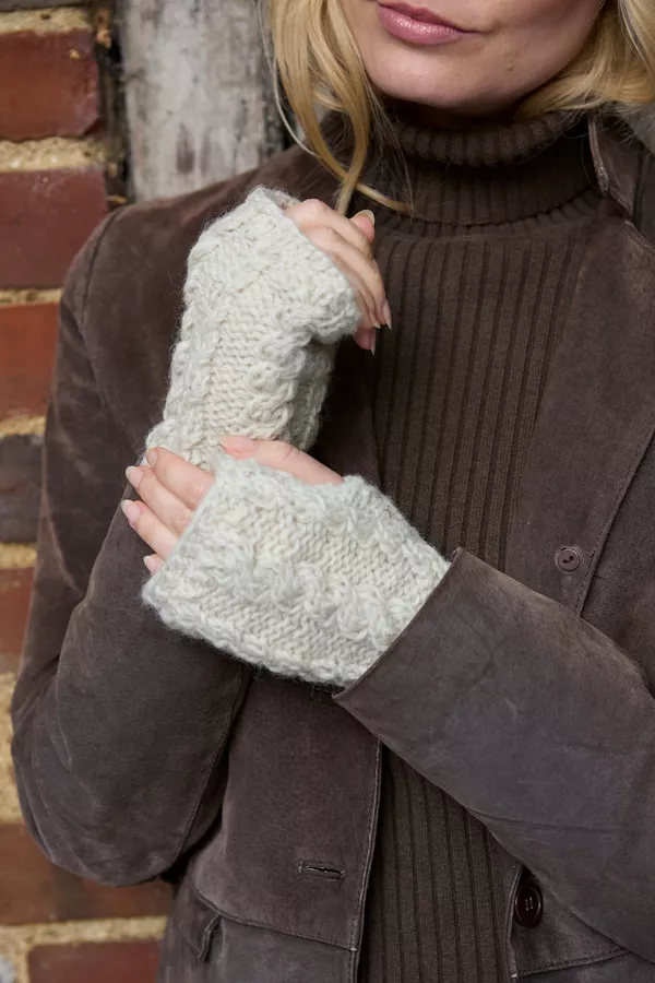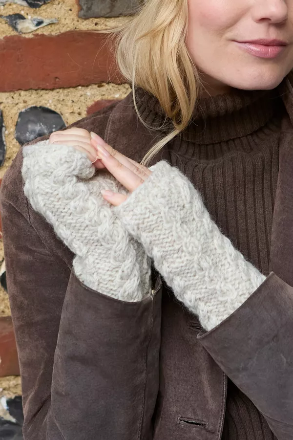 Pachamama hand knitted wool fingerless gloves, classic cable knit, fair trade and handmade in Nepal.