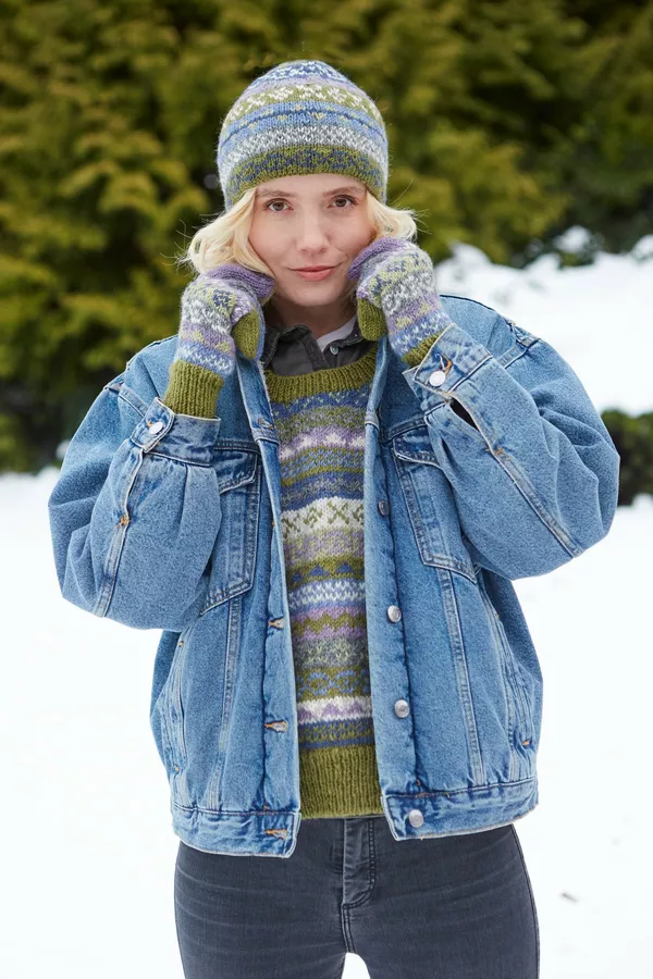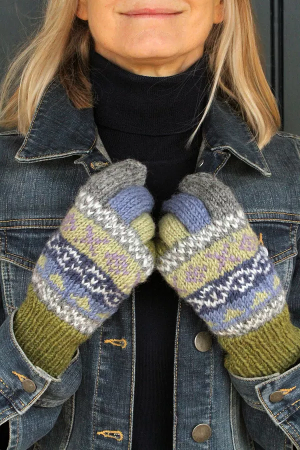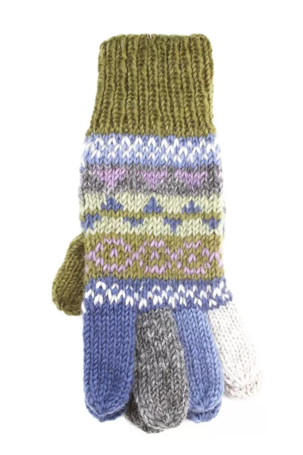 Pachamama hand knitted wool unlined gloves, colourful and classic fairisle pattern, fair trade and handmade in Nepal.