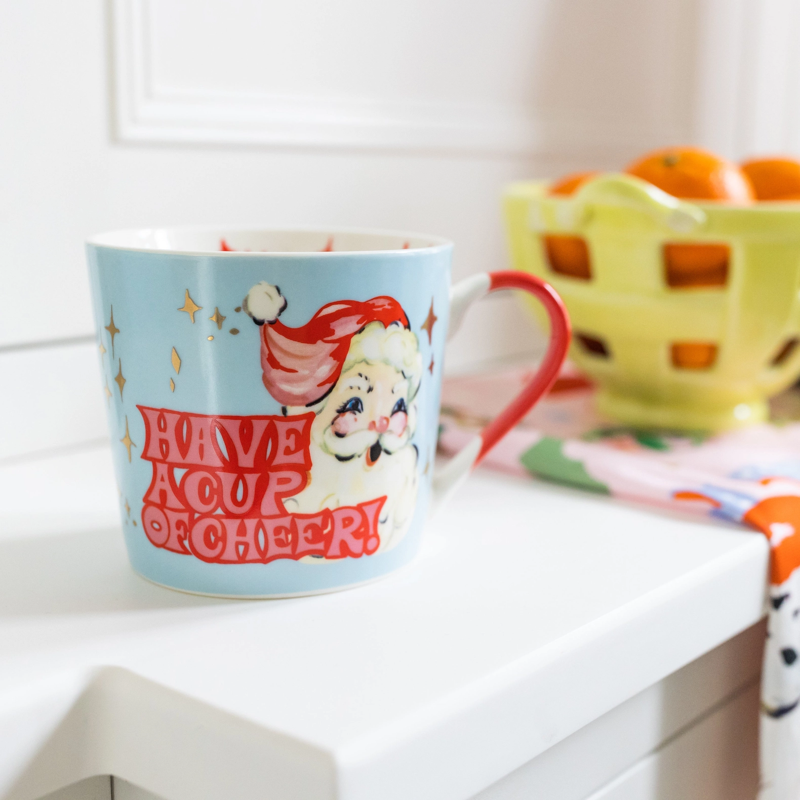 Our ‘Cup of Cheer Santa’ mug would make the perfect festive gift for yourself or a loved one! Featuring a lovely hand painted Santa with shiny gold stars over a pale blue background, with contrasting bright red handle.