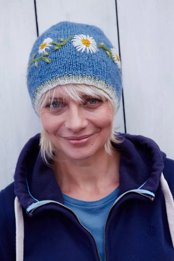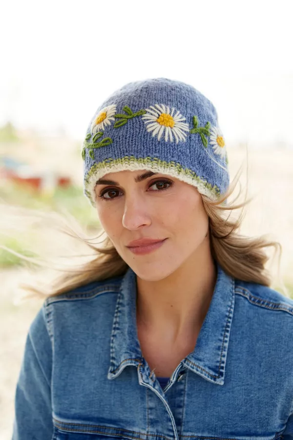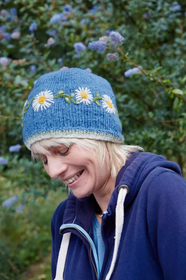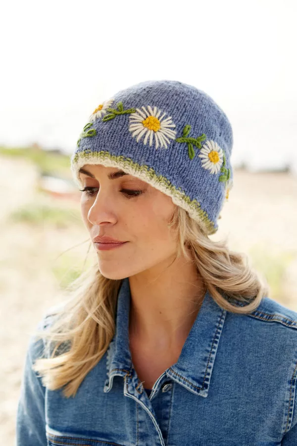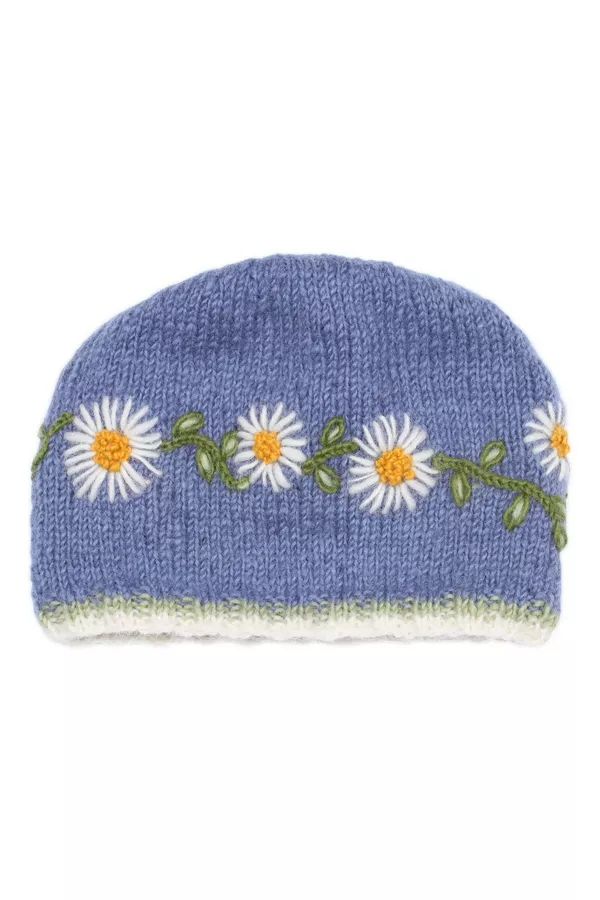 Women's hand knitted wool hat, with our vintage Daisy chain flower pattern, fair trade and handmade in Nepal.