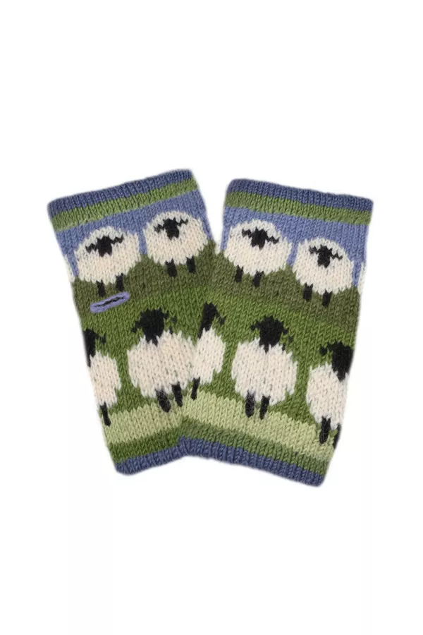 Pachamama hand made wool fingerless gloves, white sheep farm animal pattern, fair trade and handmade in Nepal.