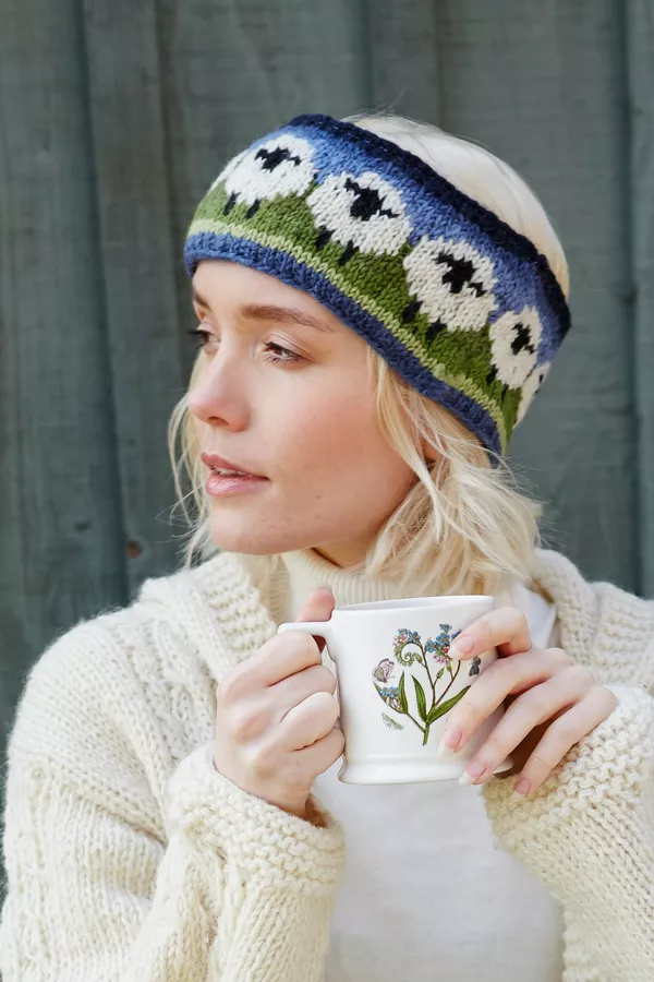 Women's hand knitted wool headband and ear warmer, with sheep farm animal pattern, fair trade and handmade in Nepal.