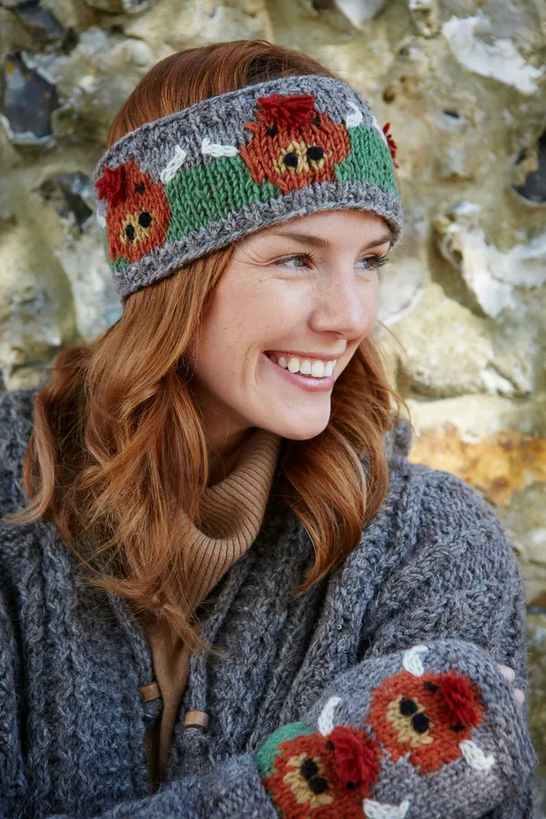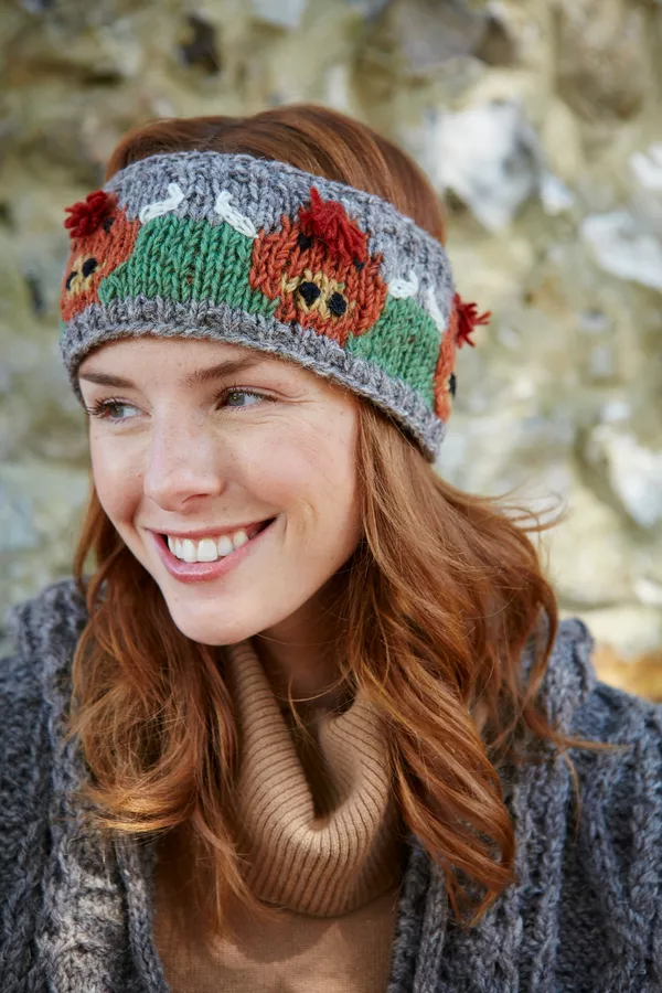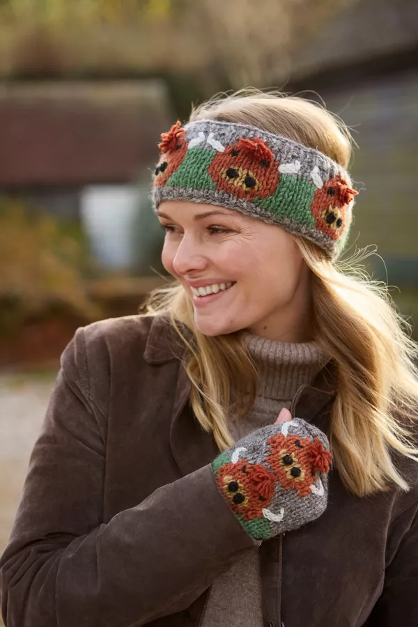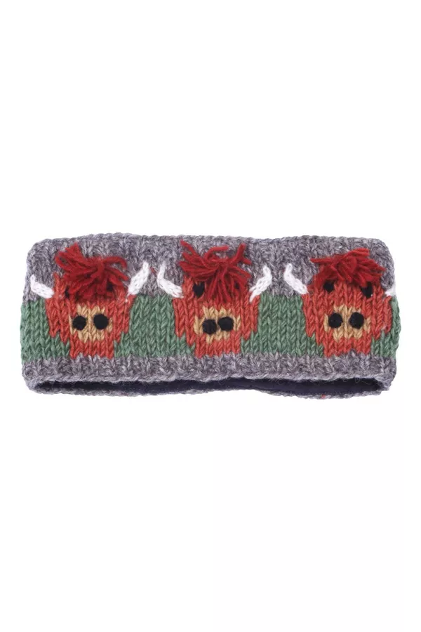 Women's hand knitted wool headband and ear warmer, with highland cow farm animal pattern, fair trade and handmade in Nepal.