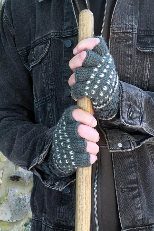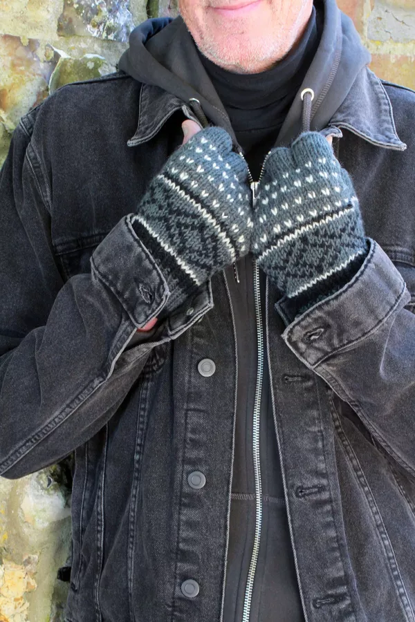 Pachamama mens hand knitted wool fingerless gloves. Fair isle patterned and individually hand knitted. Fair trade in Nepal.