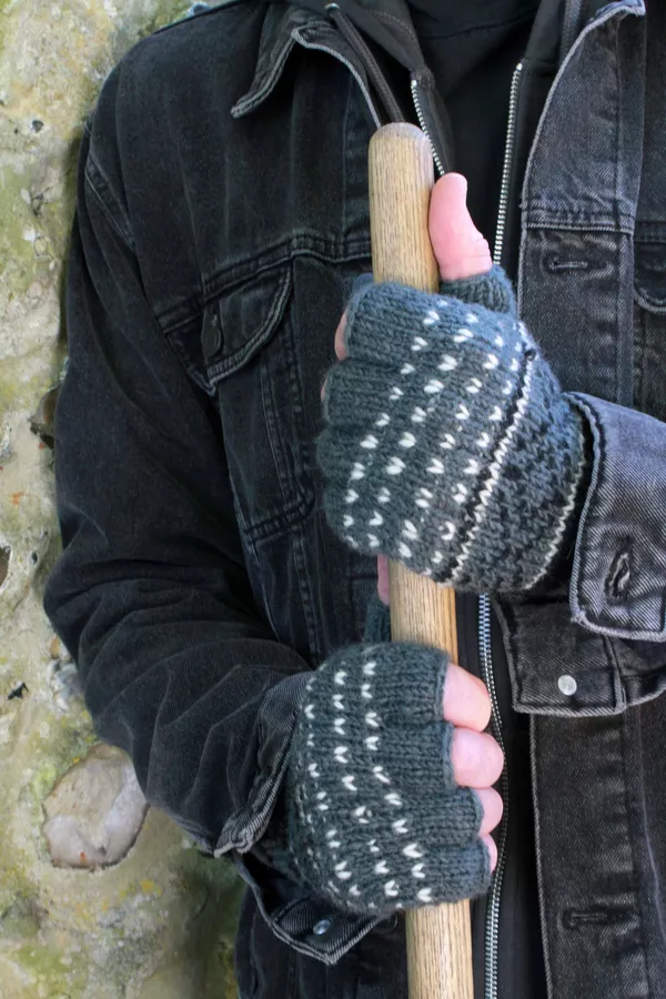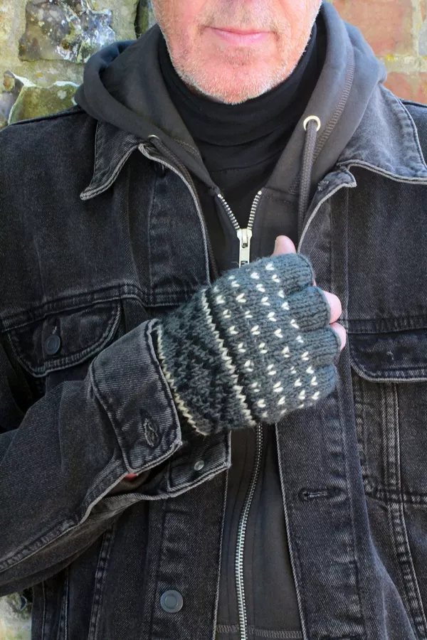 Men’s Tromso, a simple fairisle fingerless gloves beautifully handknitted in our finer wool yarn. These gloves have a bit of colour, a bit of pattern and are a great shape. An all-round winner!