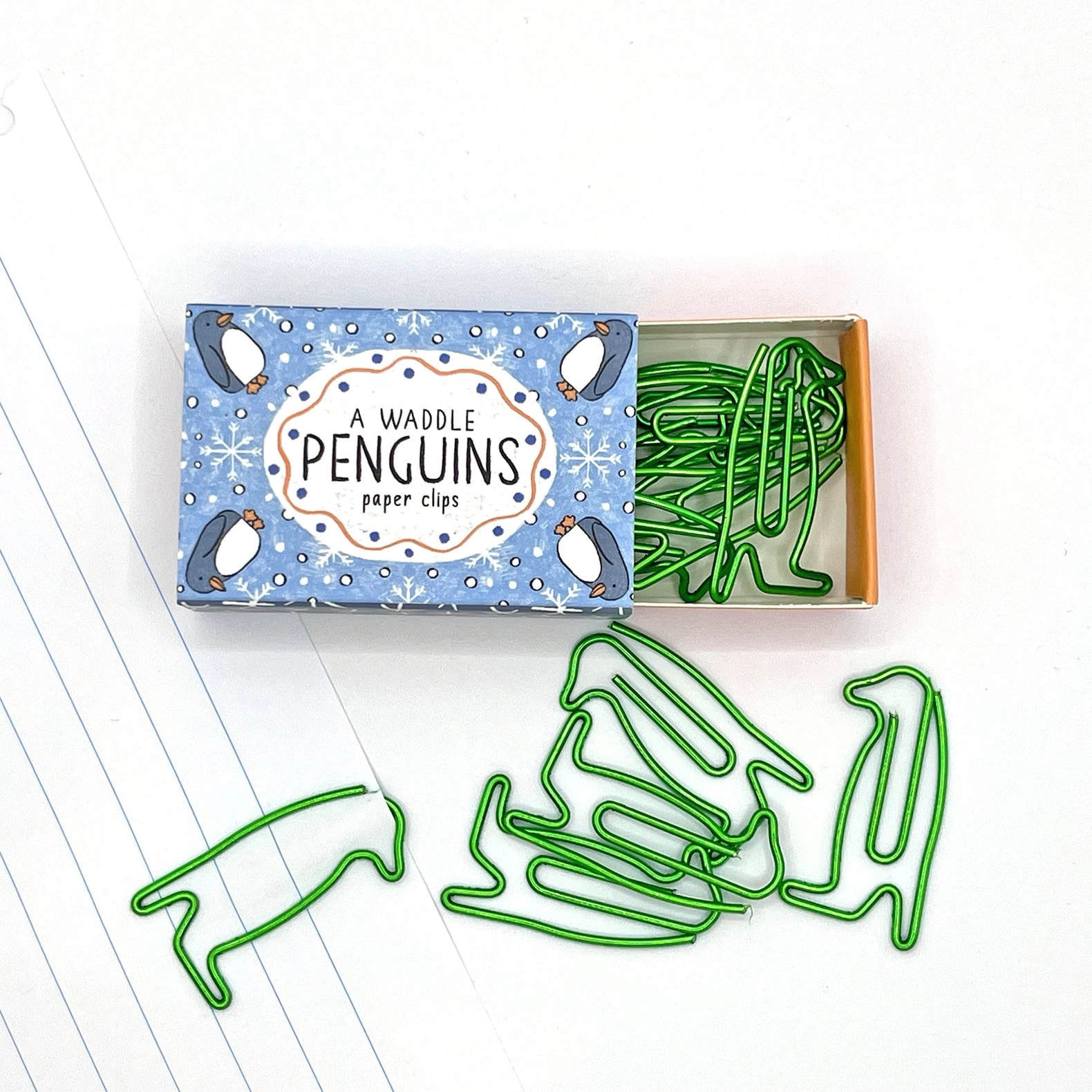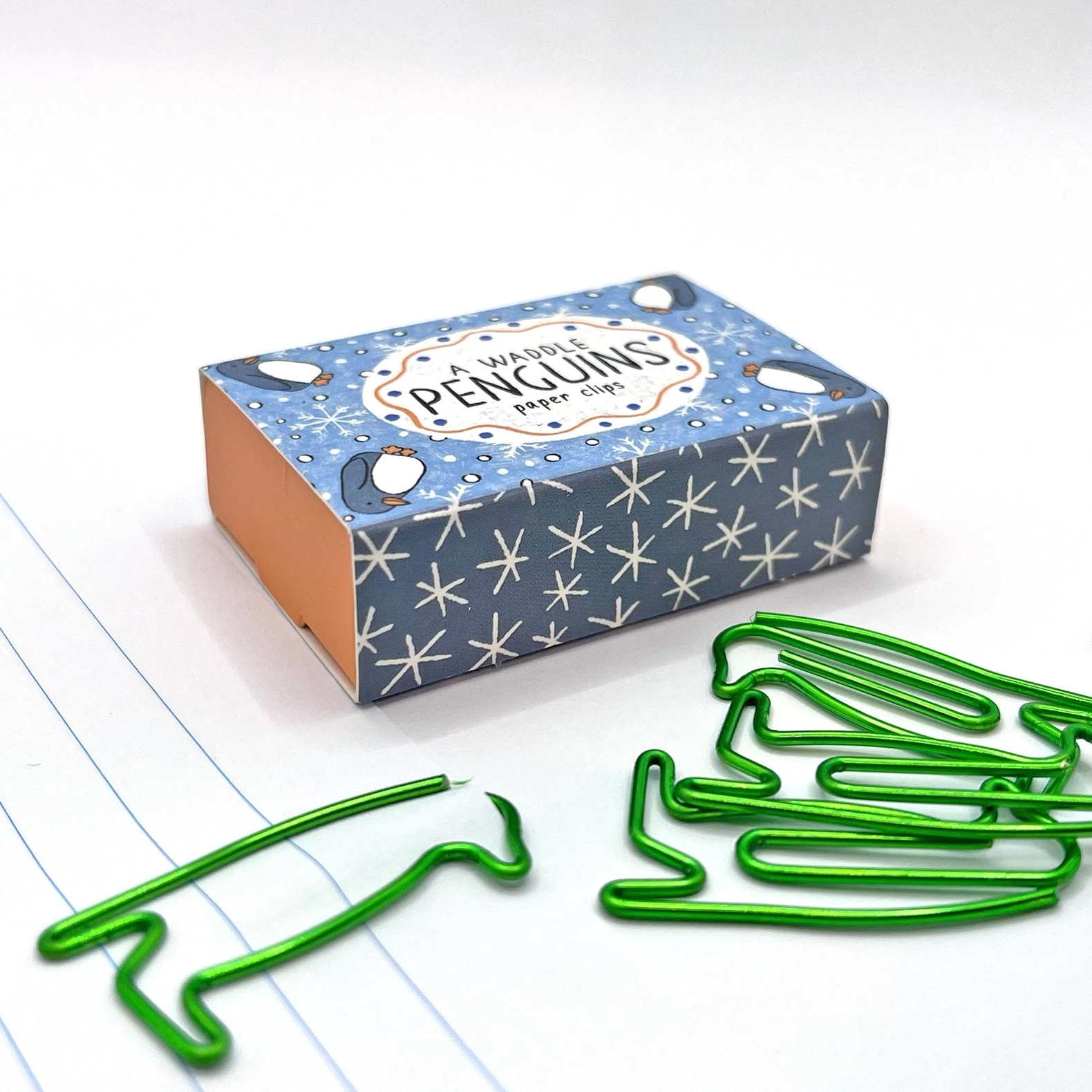 A fun set of twelve green penguin paper clips in a beautifully illustrated box. These cute paper clips are great from school work or bullet journaling. The box has been designed by Megan in Edinburgh.