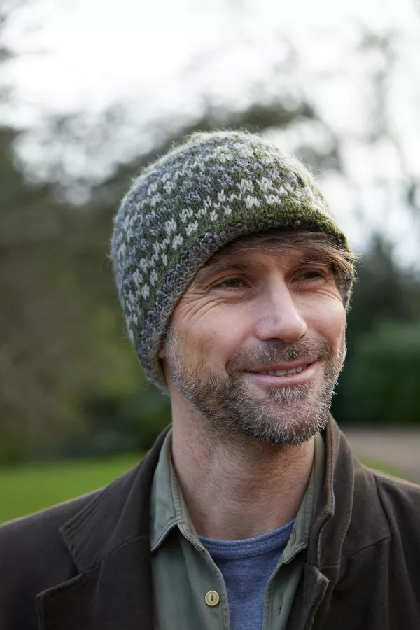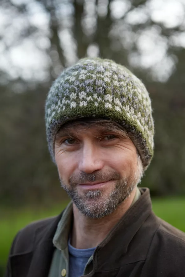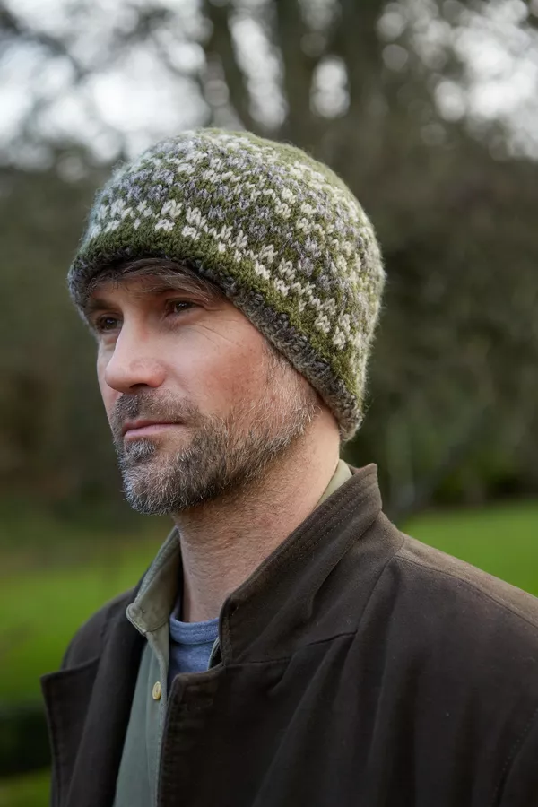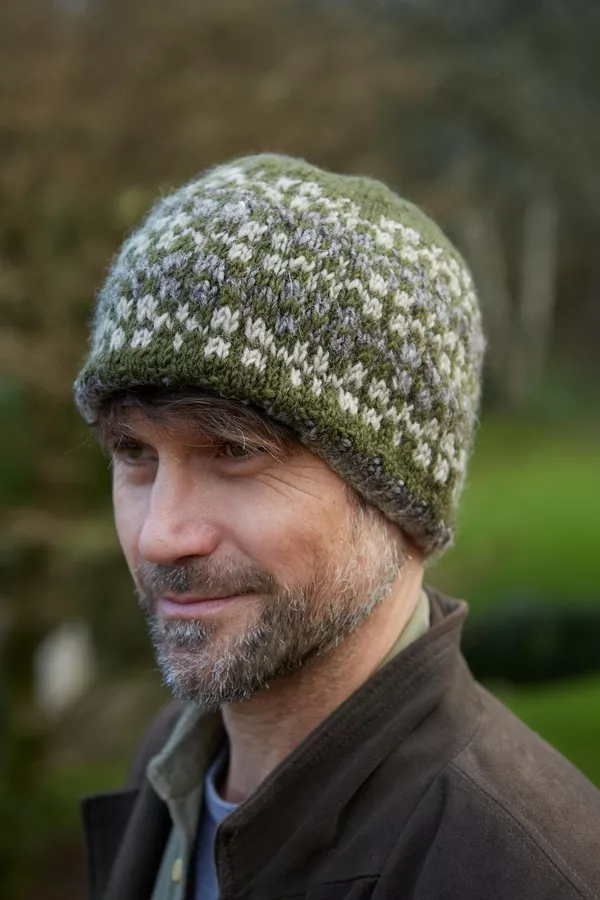 Men’s Rosslare, a simple fairisle beanie beautifully handknitted in our finer wool yarn. These beanie hats have a bit of colour, a bit of pattern and are a great shape. An all-round winner!