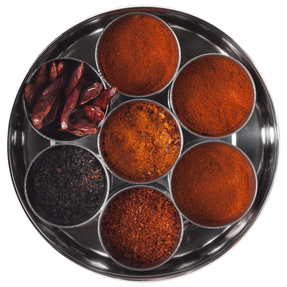 - Stainless steel spice tin with 7 removable pots and lid to keep your chillies fresher for longer