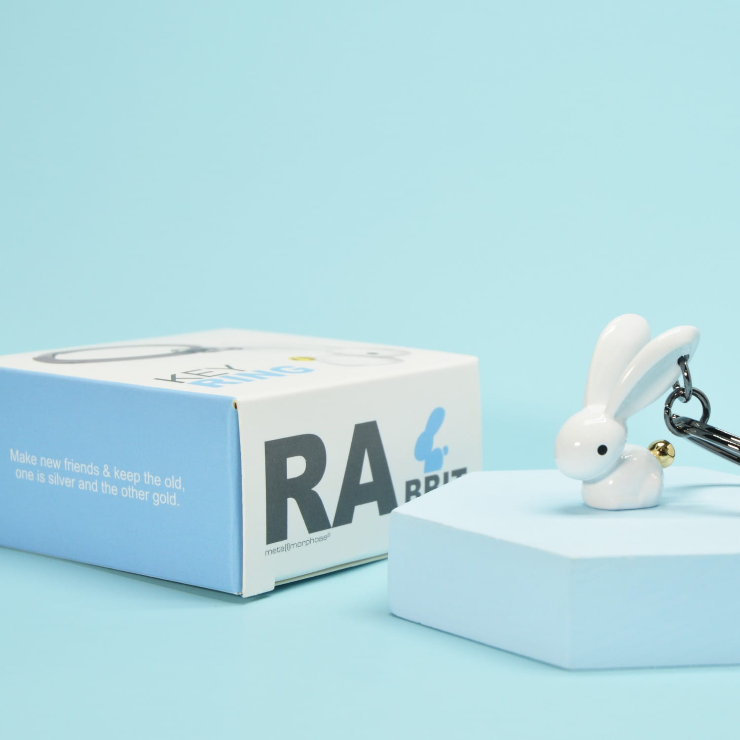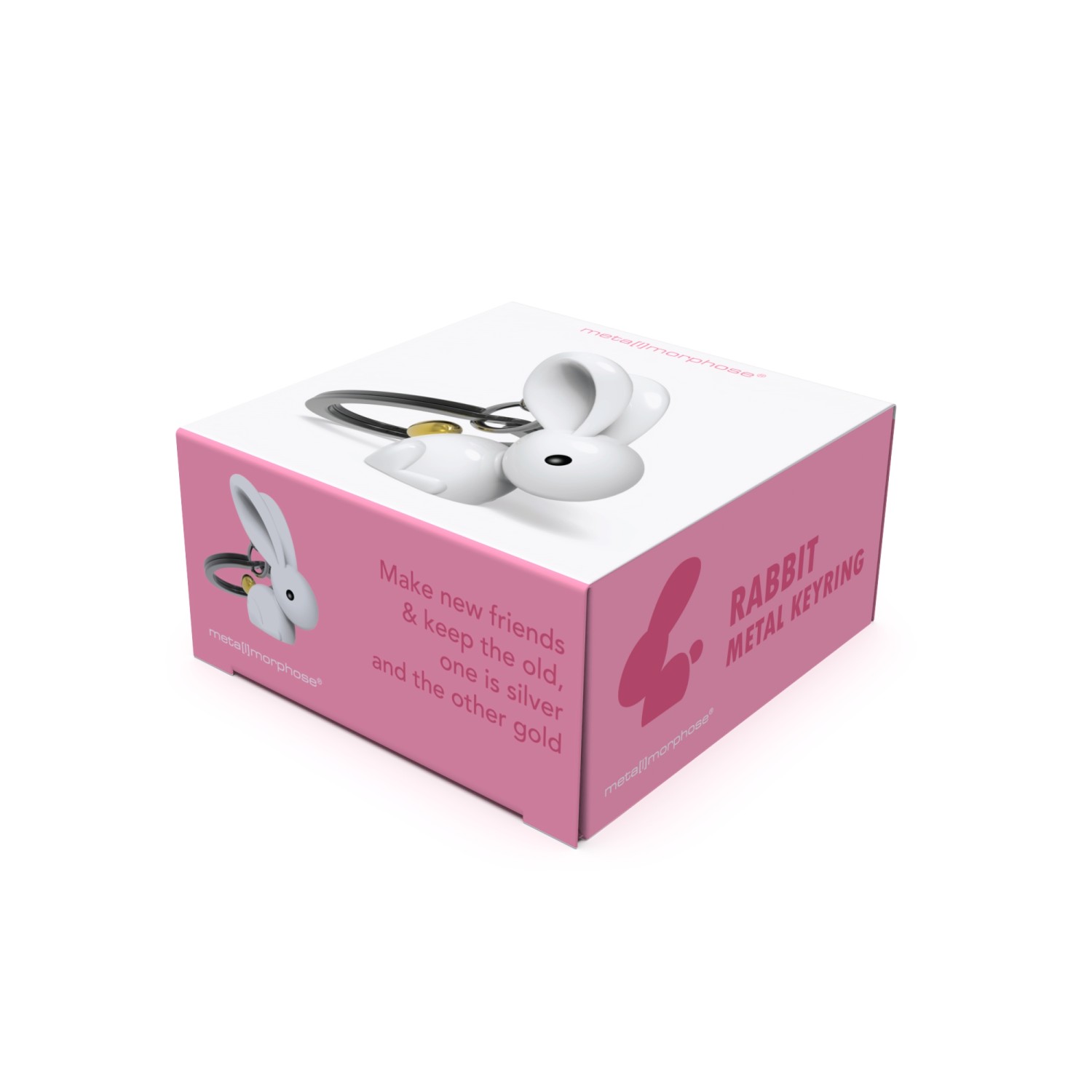 Carry around this sweet white bunny keyring from Metalmorphose. Made from durable zinc and chrome this keyring clips easily onto keys or bags. Bounce around with this fun character on your back pack or let him keep your keys safe with his friendly eyes and golden bobble tail. This bunny keyring is a great gift for all animal lovers.